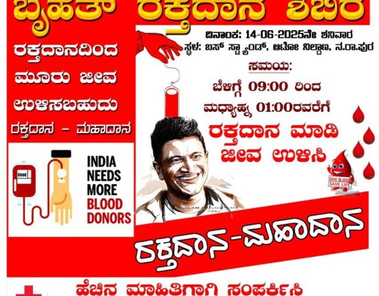 ವಿಶ್ವ ರಕ್ತದಾನಿಗಳ ದಿನಾಚರಣೆಯ ಅಂಗವಾಗಿ ಜೂನ್ 14ರಂದು ಎನ್.ಆರ್.ಪುರದಲ್ಲಿ ಬೃಹತ್ ರಕ್ತದಾನ ಶಿಬಿರ